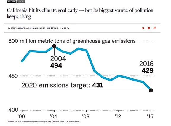 California claimed in 2018 that its greenhouse gas emission reduction target defined in the 2006 AB 32 law ridiculously labeled the “Global Warming Solutions Act” that set an emissions goal for year 2020 (reduce emissions to year 1990 levels) was achieved in year 2016 where greenhouse gas emissions were reported to have declined by 65 million metric tons (of which about 54 million metric tons is CO2) from peak year 2004 levels as noted in the graph below.