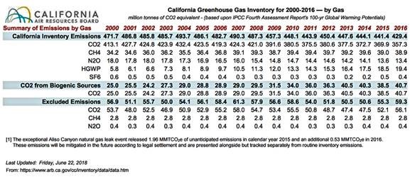 The latest CARB state greenhouse gas emissions inventory data through 2016 is summarized in the table presented below.