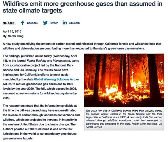 This significant oversight contained in the AB 32 law which assumed no net emissions for wildlands ecosystems was addressed in an April 15, 2015 study by the University of California at Berkeley that noted wildfire emissions were not carbon neutral.