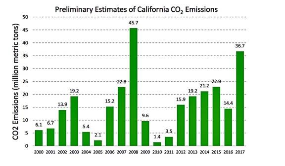 The claim for 2016 having met the AB 32 year 2020 emissions target reduction is problematic because the state failed to account for the greenhouse gas emissions from the extensive wildfires experienced since AB 32 was created with that law optimistically assuming that wildfires would be carbon neutral with no net increase in greenhouse gas emissions.