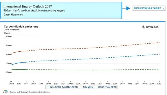 The EIA IEO 2017 report shows future world CO2 emissions totally controlled by the developing nations which climb above 2016 levels by an additional 2.7 billion metric tons by 2030, climb by 6.7 billion metric tons by 2045 and climb by nearly 8 billion metric tons by 2050. Thus the world’s developing nations future increased CO2 emissions render any CO2 emission reductions from California or the U.S. totally irrelevant.