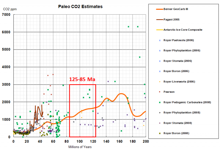 If we look at the mid-late Cretaceous period, we can see that the volcanism–>CO2 –>warming narrative doesn’t quite work. Even if the climate sensitivity is 1.28 °C per doubling of CO2… CO2 was declining during the 125-85 Ma “time of severe global warming” Dr. Sorkhabi associates with extremely prolific mid-late Cretaceous hydrocarbon source rocks.