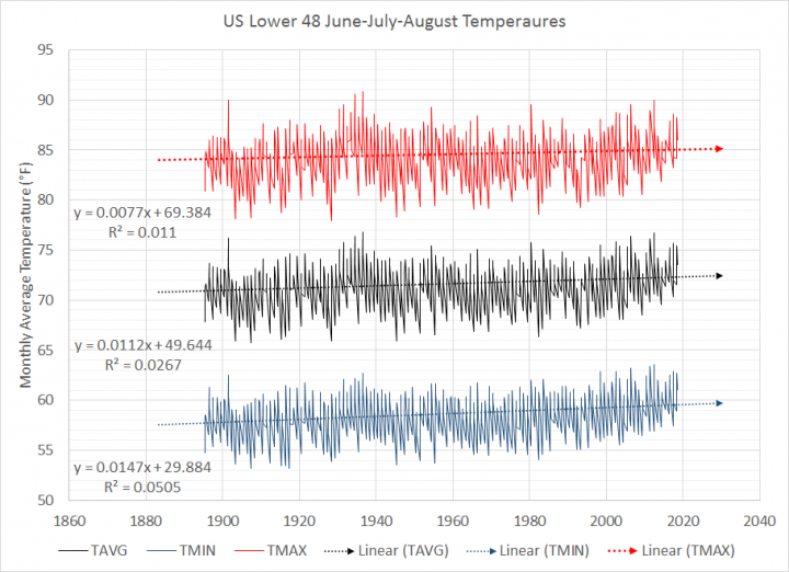 The slope of the average temperature is only 0.0055x… That’s 0.55 °F per century, with an R² = 0.0084… The slope of the high temperature is only 0.0011x… 0.11 °F per century, with an R² = 0.0003.