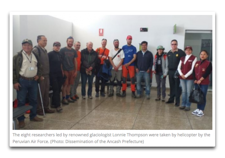 The expedition, made up of 8 Peruvian, American, Italian, French and Russian scientists, and led by the renowned glaciologist Lonnie Thompson, was transferred from the base camp of Huascarán to the town of Musho last Monday at 10 pm