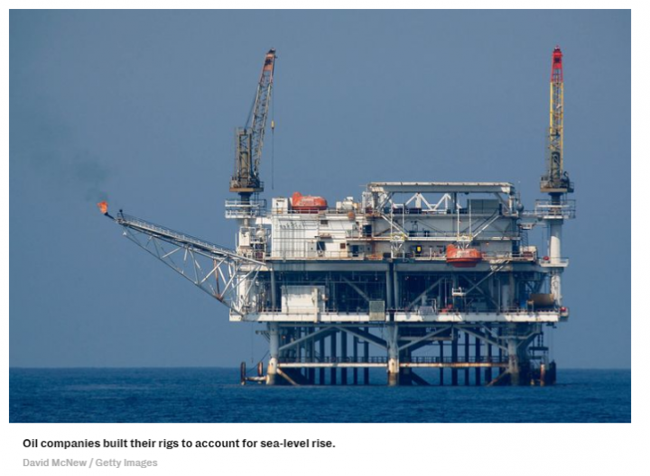 The stupidly written caption is probably referring to the elevation of fixed offshore production platforms. This is totally unrelated to sea level rise; it’s entirely due to seafloor subsidence caused by the extraction of hydrocarbons and lessons learned from the 2005 hurricane season. It’s pretty well limited to very large offshore fields where the platforms have been in place for decades.