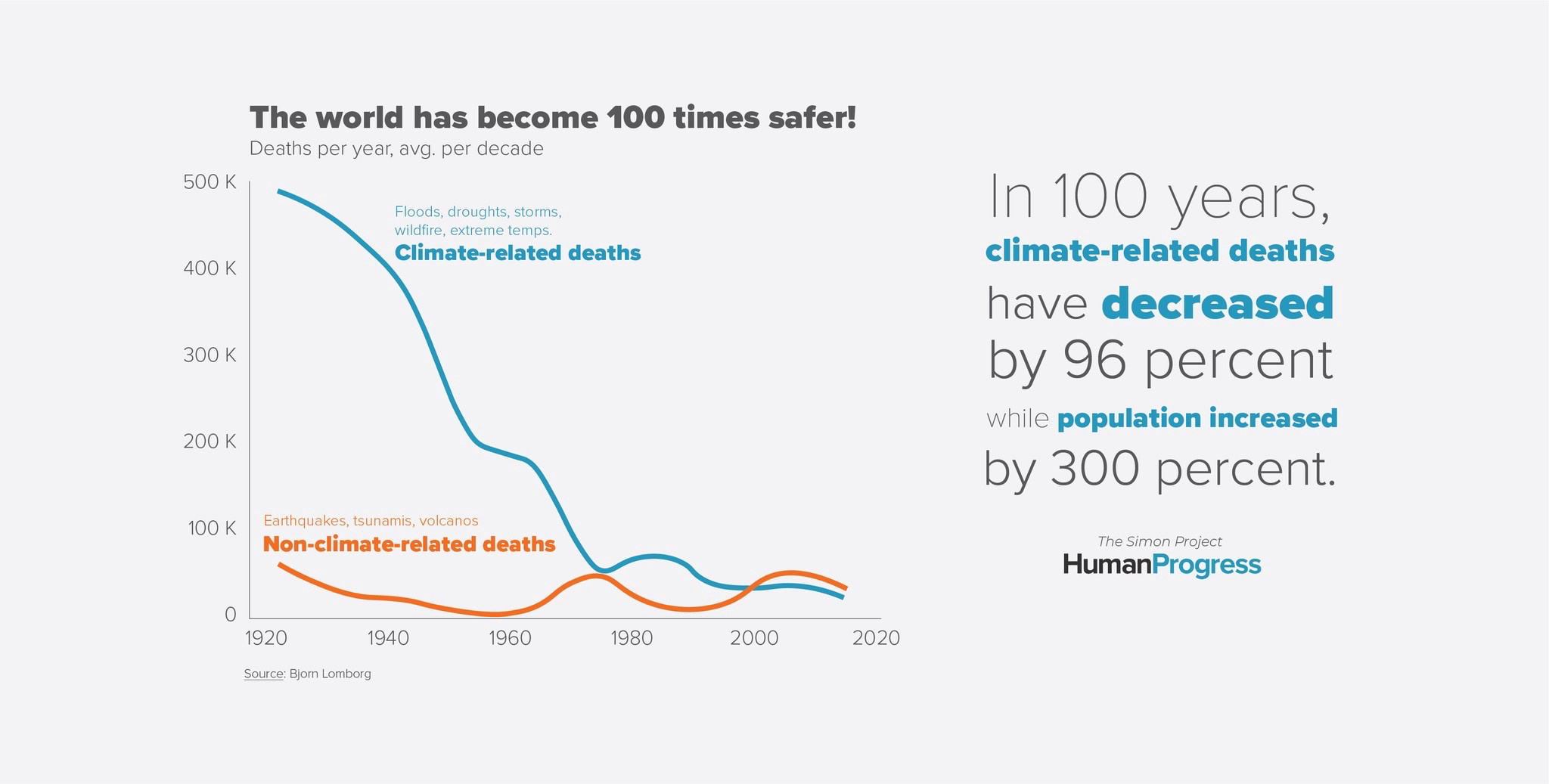 Contrary to reports in the popular press, climate scientists have not been reporting more hurricanes, flood, fires and so on due to Global Warming. There are concerns that extreme weather events might increase but not for a long while yet, and maybe not. Equally importantly United Nations data shows that deaths due to extreme weather events have declined a staggering 96% over the past century, and that’s in spite of population growth. Why? How? Largely due to better buildings and infrastructure, better emergency services, better hospitals and so on. In other words, human technology and wealth levels, both of which continue to improve. So even predictions of increased deaths due to a warmer planet seem far fetched, while the idea that global warming means “the end is nigh” is sheer apocalyptic fantasy.