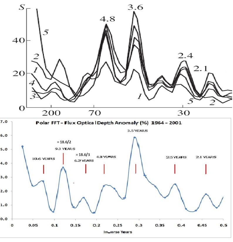 Remarkably, the 6.2 (& 6.0), 4.8, 3.6, 2.4, and 2.1-year periodicities in the ENSO/SOI periodogram of Siderenkov (2000), are also clearly evident in the FFT of the flux optical depth anomaly data.