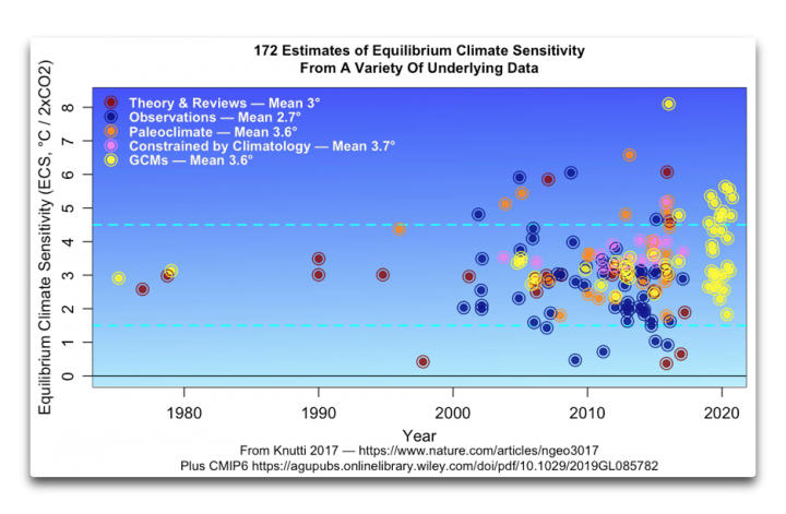 The estimated range of ECS has not changed much despite massive research efforts. The IPCC assessed that it is ‘likely’ to be in the range of 1.5 °C to 4.5 °C (Figs 2 and 3), which is the same range given by Charney in 1979. The question is legitimate: have we made no progress on estimating climate sensitivity?