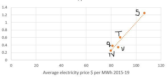 Here’s a fun graph. I plotted the installed renewables per head of population of each state vs the average cost of electricity in those states, for the last 4 years for the eastern seaboard of Australia.