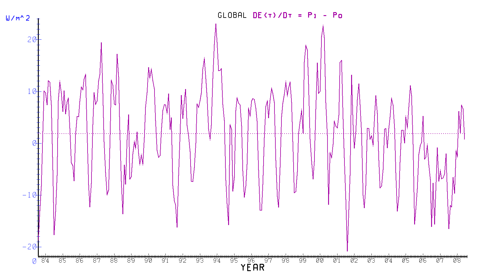 Psun is the non reflected solar input (yellow), Pi is net solar input (blue), Po is total radiated by the planet (brown) and their difference is the flux in and out of the planet’s thermal mass, dE/dt (red). The equivalent radiant BB emissions of the surface corresponding to its temprature are also plotted. The first 3 plots represent the monthly averages over 3 decades of satellite data. These plots are all normalized and centered on their averages, so pay careful attention to the scales (avg+lim and avg-lim) which are different per item plotted.