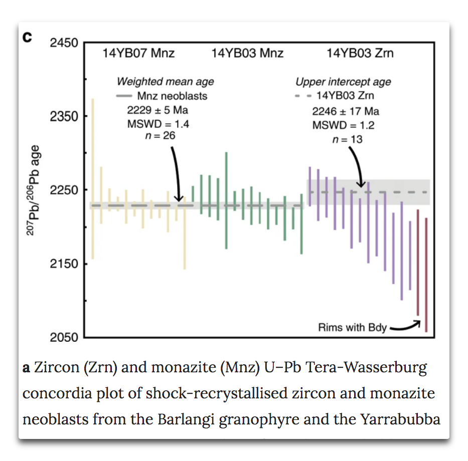 Y’all know me, I love data. I took a look at the paper and I went “say what”? They claim their dating is 2229Ma ± 5 Ma. Here’s the money graph: