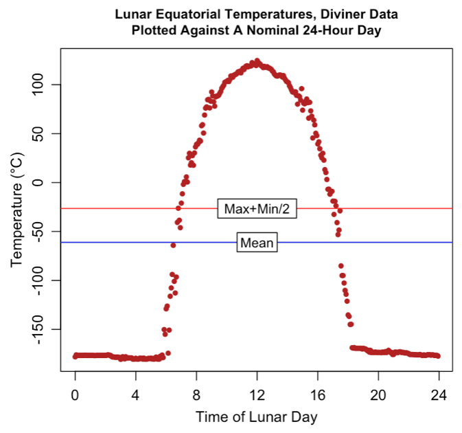 A while ago, I wrote a post called “The Moon Is A Cold Mistress”. In that post I discussed how the average temperature is not accurate when there are huge swings in temperature. Or to be clearer, I discussed why the average temperature of the moon is much lower than you’d expect given the distance from the sun. Read the post for the full discussion. Here’s the money graph from that post.