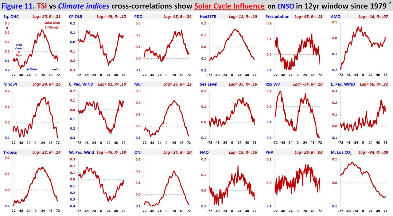 The R values of many Fig. 11 plots would be of higher significance if instead of just using TSI for the CCs as I did there if the TSI function used in lieu of TSI was the detrended sum of the TSI anomaly above/below 1361.25 W/m^2 as shown in the thick red line of Fig. 13e-g linked further down, which is the ocean warming TSI threshold I empirically derived in 2014/15, because that TSI function accounts for the ongoing accumulation of OHC from ASR at deeper depths that upwells slowly, affecting the surface temperature but lagging TSI.