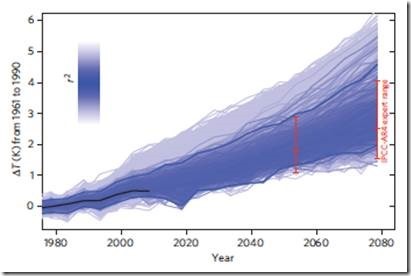 While the 95% probability envelope characterizes the variance (and hence, precision — low) of the ensemble runs, it begs the question of the accuracy of the mean. That is, we can say something about the repeatability of the multiple runs, and probability of future runs; however, without comparison of the post-calibration mean to actual measurements, we don’t have a quantitative measure of accuracy. If the variance envelope is large enough, it will encompass reality. Unfortunately, that isn’t very useful for predicting what we can expect in the future unless we can say, with confidence, what the standard deviation is of the run(s) that do correspond to reality! It is necessary to calculate the bias and slope of the mean and correct the results accordingly. Climatologists routinely adjust historical temperature data, why not future data? It isn’t necessary to wait 30 years (Although, we do have Hansen’s predictions!). A decade should give us a fair idea of whether the bias and slope of the mean are even reasonable. Indeed, a decade out can be expected to be more accurate than three decades.
