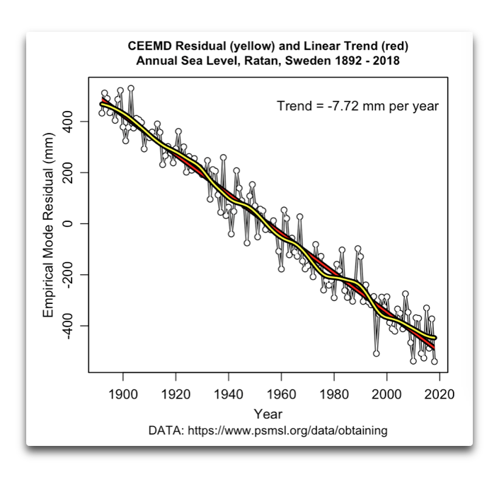Now, I’ve recently started to use a sea-level analysis method I developed myself. It’s based on a lovely kind of analysis called “Complete Ensemble Empirical Mode Decomposition” (CEEMD). I described CEEMD in a 2015 post called “Noise Assisted Data Analysis“.