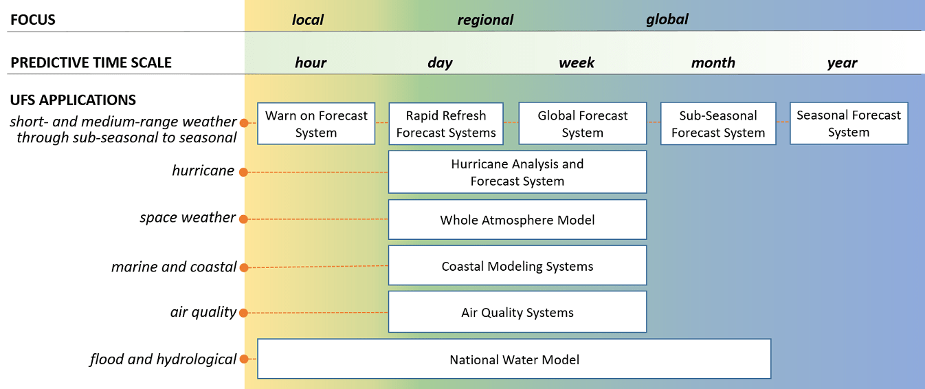 UFS will enable NOAA to simplify its production suite of forecasting models from many independent systems, each of which has to be improved and maintained separately, to a single seamless modeling system with fewer, more comprehensive applications. UFS applications, which each provide guidance for a particular forecast, span local to global domains and predictive time scales from sub-hourly analyses to seasonal predictions.