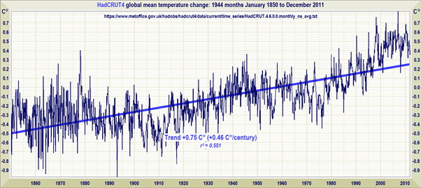 - How much warming has actually been measured to occur up to a given date? From 1850-2011, the year to which data were updated for IPCC’s latest Assessment Report, just 0.75 degrees’ warming had occurred (HadCRUT4).