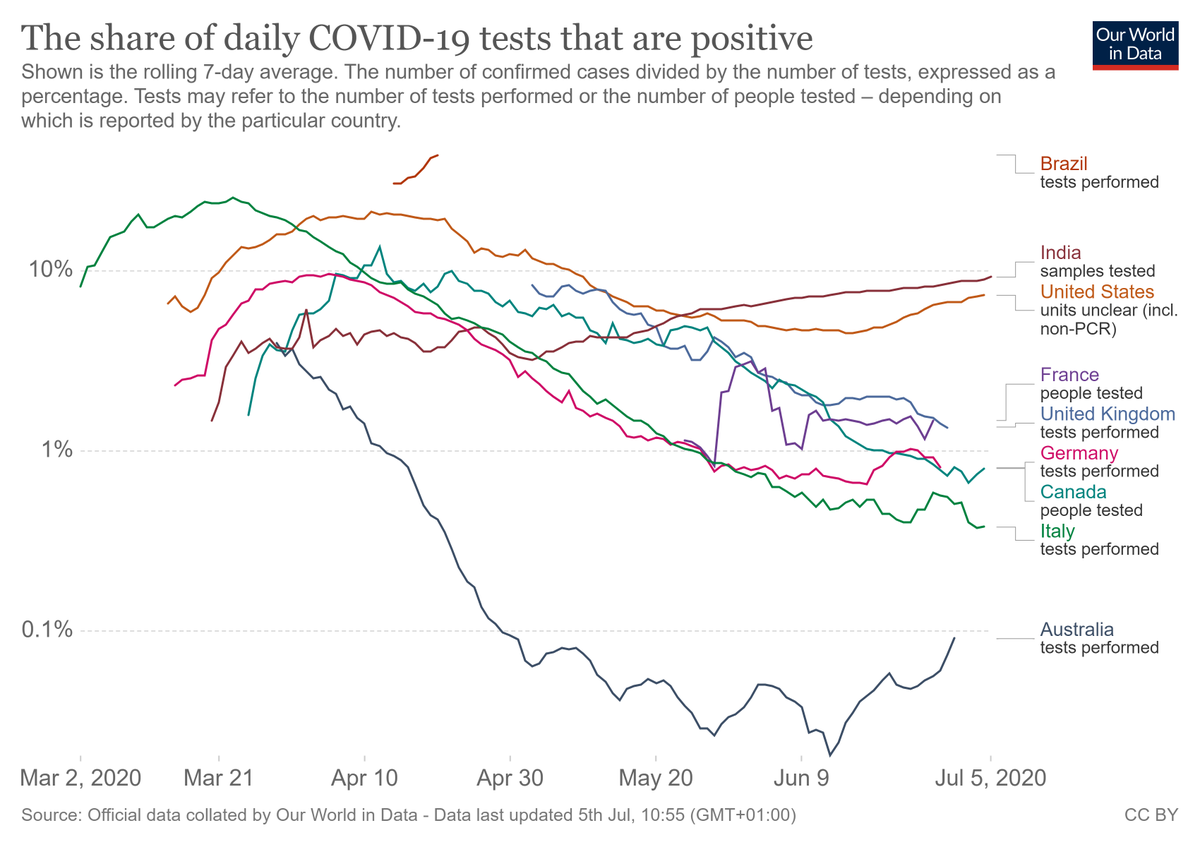 Cases of covid19 per test should be a falling curve if covid cases are reducing. Cannot be a rising curve if covid is increasing because testing is increasing. USA are finding more cases per test. The rise in cases is not due to more testing!!!!