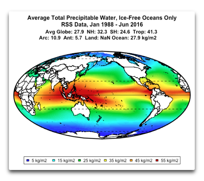 (Unfortunately, I can’t find numbers for global TPW. However, TPW above the ocean is bound to be greater than TPW above the desert or in the mountains. So the values above represent a maximum possible value for the global TPW.)