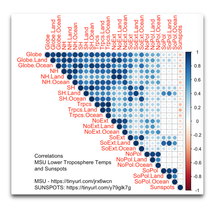 Figure 1. Correlation between UAH MSU monthly lower tropospheric temperature anomaly in various areas of the planet and monthly sunspots, Dec 1979 to June 2020. Blue is positive correlation, red is negative. Latitude bands as follows: Global -85 to +85 latitude