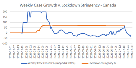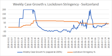 The “stringency index” is a summary number (expressed as a percentage) of how far a country is locked down. 0% is business as usual, while 100% represents maximum restrictions for all the criteria considered. The stringency data supplied to Our World in Data, and the supporting .csv file of daily data, both come from the Blavatnik School of Government, which like Our World in Data is a part of Oxford University. The file I used was the version from August 5th.
