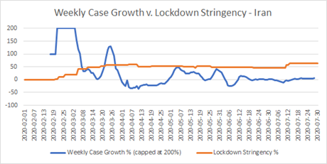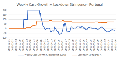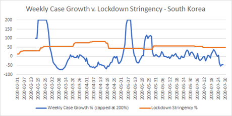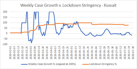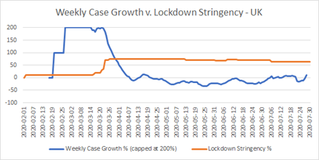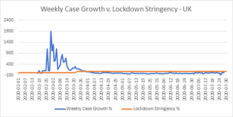 Now, there are a couple of instances here of what I would have expected to see when a lockdown, which has had a real effect, is lifted. There’s a definite knee-bend in weekly case growth around May 4th, and another more debatable one about June 4th. According to the Blavatnik data, on May 4th there was a package of five measures: