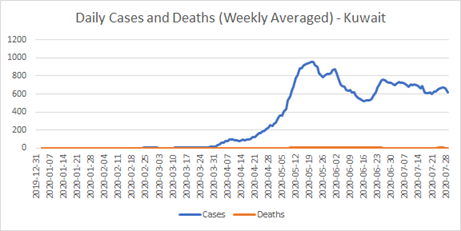 Another effect of this means of reporting – not visible on this graph, but you can see it in several other countries’ data – is that new case counts for the very latest few days will usually be understated. They will be added to as delayed test results come in. So, if you see an apparent downturn in new cases in the last few days before the end of the data, it’s very probably spurious, and should not be taken into account in any conclusions. Similarly, perhaps, for an apparent upturn; maybe reports from the cities come in quicker than those from the boondocks?