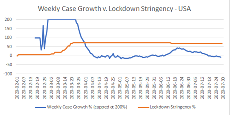 Now, look back at that graph of weekly case growth versus stringency limit. The hypothesis that lockdowns and relaxations ought to trigger drops and increases in weekly case growth would suggest that the blue line ought to move in the opposite direction to the brown, soon – or, at most, in a week or two – after it. Since the big lockdown in March, does that graph show any evidence of such a movement? Not to my eyes. Remember, also, that shops and pubs re-opened in three phases on June 1st, June 15th and July 4th, none of which show up in the Blavatnik data. If I squint hard, I can maybe see a tiny upward knee-bend in the blue line in the first week of June; but it’s not conclusive.