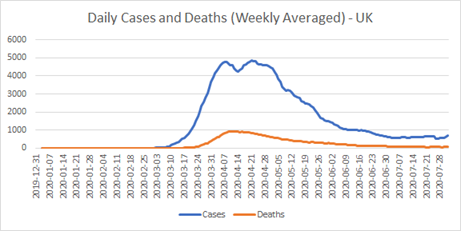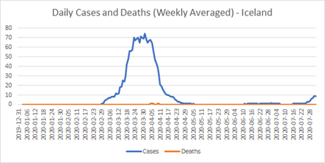 Well, there you have it. As in the UK, the weekly case growth was declining before any effects on Icelanders of even the first lockdown edict could kick in. Moreover, the first cases for more than a month appeared right after they went from banning high-risk international arrivals back to quarantining them. They did close bars and close-proximity businesses like hairdressers from late March to May. But otherwise, I think the Icelanders have got the job done; maximum protection at minimal cost. It will be interesting to see how quickly the latest outbreak of new cases dies down.