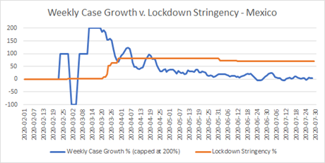 Two of these seem to have been followed by increases in the weekly growth rate, both a couple of weeks afterwards. One was the re-opening of many schools. The other was the major package of measures on June 6th. The change on July 3rd seems to have had a more immediate effect in the opposite direction, even though only implemented regionally.