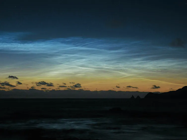 Noctilucent clouds are very rare – from Australian Antarctic stations we’ve recorded about ten observations since 1998. They occur at an altitude of about 80km in the polar regions during summer. You can only see them from the ground when the sun is below the horizon during twilight, but still shining on the high atmosphere.