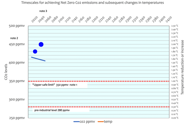 Note 1; Figure 1 below assumes a 430ppm concentration by 2030 or 450 ppm by 2050 based on Co2 levels continuing to rise from 2020 until towards the chosen date, when they would taper off, before becoming net zero. Consequently any estimated reductions need to start from that point. Figure 1 is left blank waiting for data from replies to be inserted;
