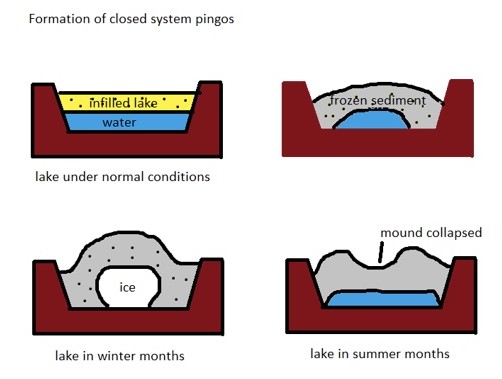 Basically, a Pingo is a plug of ice that can form due to poor drainage, pushing up a small hill as the ice expands, and when the condition of the soil changes, the ice melts, and the soil around it collapses, leaving a crater.