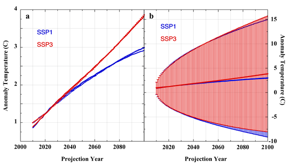 Figure 3, panel a: points are the IMAGE 3.0 air temperature projection of, blue, scenario SSP1; and red, scenario SSP3. Full lines are the emulations of the IMAGE 3.0 projections: blue, SSP1 projection, and red, SSP3 projection, made using the linear emulation equation described in the published analysis of CMIP5 models. Panel b is as in panel a, but also showing the expanding 1 s root-sum-square uncertainty envelopes produced when ±2.7 Wm⁻² of annual average LWCF calibration error is propagated through the SSP projections.