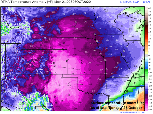 Temperatures were 30-50 degrees below-normal late Monday in a widespread area from the Dakotas to Texas and west to the Rockies. Map courtesy weathermodels.com, NOAA