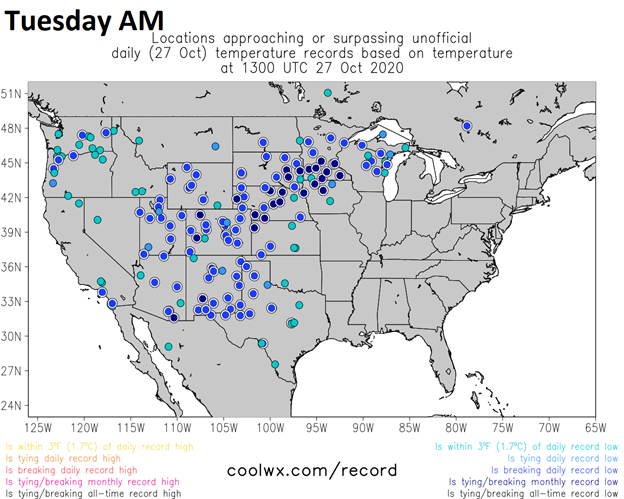 Numerous record or near record low temperatures on Tuesday, October 27th across the central and western US. In many spots, the lowest temperature ever recorded for the month of October was observed. Map courtesy coolwx.com, NOAA