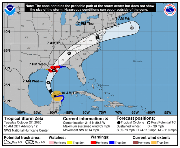 Tropical Storm “Zeta” is likely to make landfall late tomorrow in the southeastern part of Louisiana – perhaps as a category 1 hurricane. Map courtesy NOAA/NHC