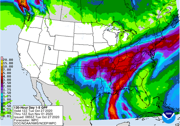 A significant rain event is coming to the Tennessee Valley, Mid-Atlantic and Northeast US from Thursday into Friday with the combination of the remains of “Zeta” and a strong upper-level low. Map courtesy NOAA/WPC