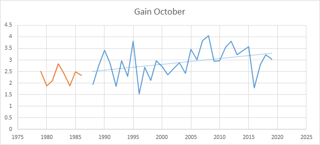We could also look at the November sea ice gain, which has also been increasing since the 1980s