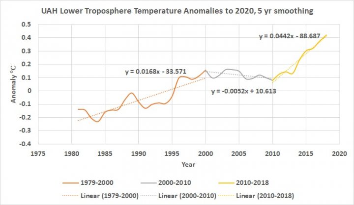 In Figure 1 we see that the five-year smoothed tropospheric temperatures rise 0.17 degrees per decade from 1979 to 2000, then they decline at 0.05 degrees per decade from 2000 to 2010, and then rise again from 2010 to 2018 at 0.4 degrees per decade.