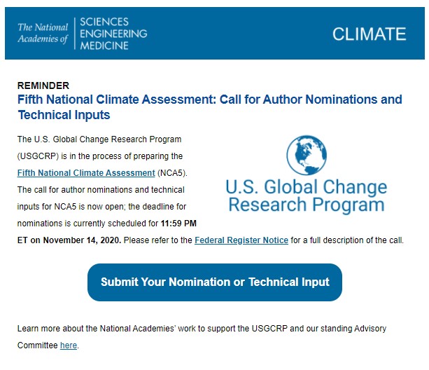 The deadline for “self-nomination” as an author for the 5th U.S. National Climate Assessment (“NCA5”) is 8:59 PM PST, Saturday, Nov. 14, 2020. So time is short.