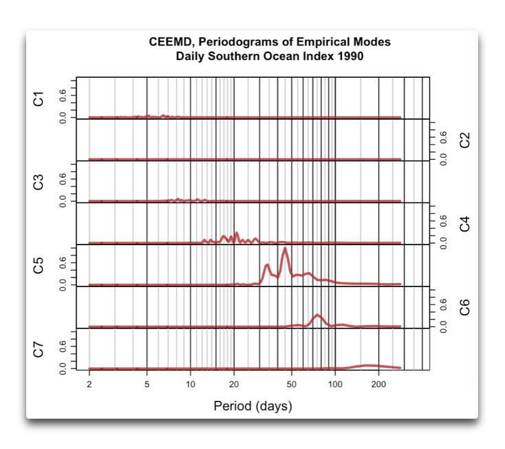 OK, I’m not seeing the tidal effect in the SOI. I used unsmoothed daily pressure data from Papeete and Darwin, subtracted one from the other to get the basic SOI. Then I did a CEEMD analysis to see what kind of cycles have power in the signal. Here’s that result: