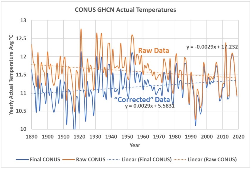 Figure 4 shows the actual measurements from the stations, these are not anomalies and the data are not gridded. The raw data shows CONUS is cooling by 0.3°C per century, while the corrected data shows CONUS is warming by 0.3°C degrees per century. These lines, like all the fitted lines in this post, are Excel least squares trend lines. The lines are merely to identify the most likely linear trend in the data, thus the R2 is irrelevant, we are not trying to demonstrate linearity.