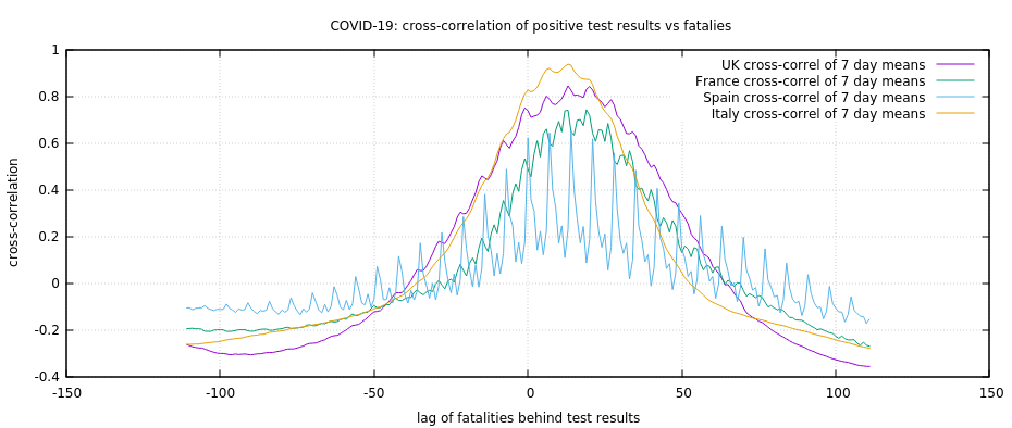 Looking at the cross-correlation of deaths and positive test results ( aka “cases” ) to examine the delay between test results and eventual fatal outcome, we find there are significant differences in the lag. France and UK peak at about 14-15 days , Italy is only 10 days. Spanish data has serious structural inconsistencies over time leading to massive swings even after taking 7day means to reduce the effects of week variation in testing and reporting.