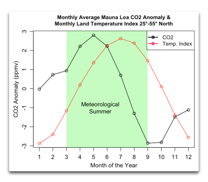 Curious. CO2 peaks in May, and drops after that. Sure doesn’t seem like “Plants are accumulating carbon in the spring and summer when they’re active” to me. Meteorological spring is March through May, and meteorological summer is June through August.