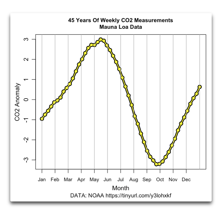 d) You’ve shown 2 years of data. Here is the average of the 45 years of weekly Mauna Loa data: