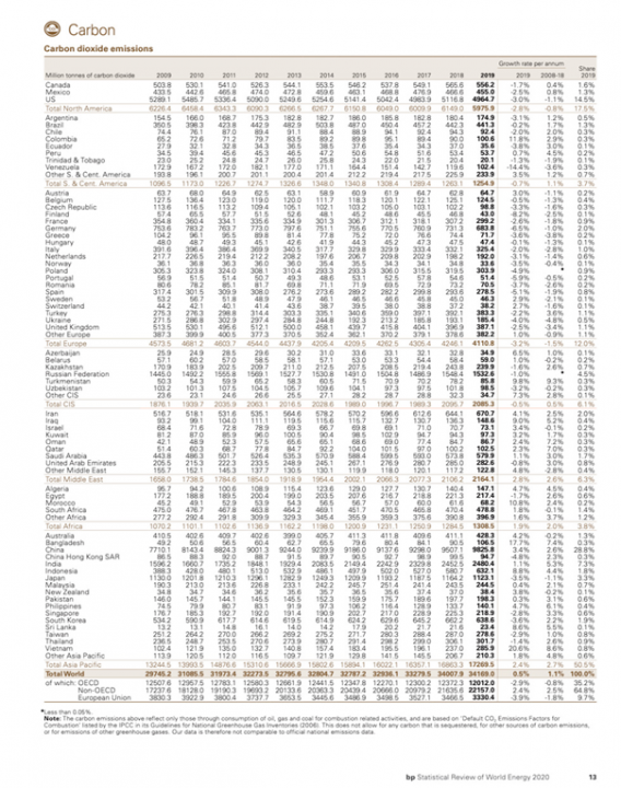The summary table presented below (the reports Excel spreadsheets are much more detailed) from the BP report shows global CO2 emissions by year and country covering the years 2009 through 2019 that identifies which countries are causing the majority of global CO2 emissions as a result of their energy use.