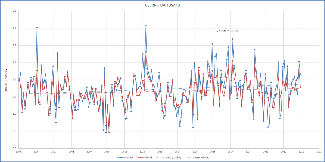 USCRN has brought the manic per-satellite warming adjustments under control and now there is no more warming.