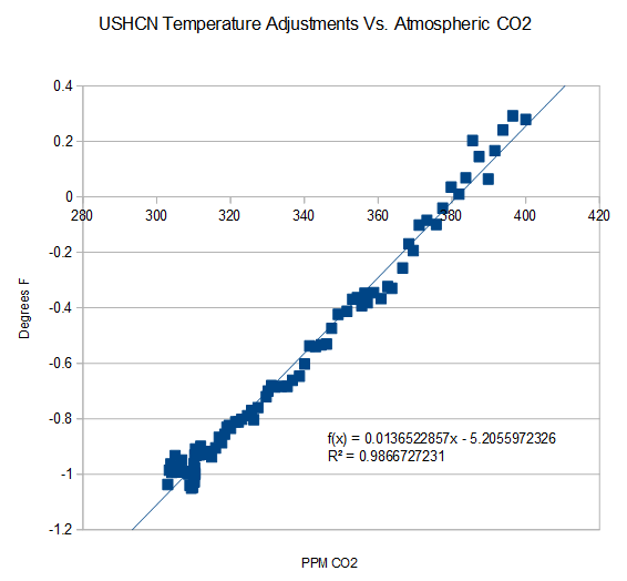As an after thought, removing what I consider an outlier would increase the slope of the OLS regression line, and lower the y-intercept. That would suggest possible cooling in the absence of warming resulting from land-use changes, i.e. urbanization.