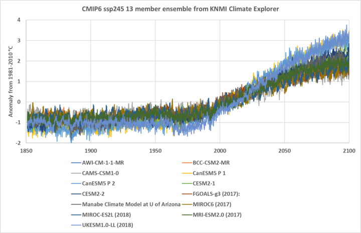 All curves are global average temperature anomalies from the 1981-2010 average temperature. Notice the 19th century spread of results is over one degree C. The current spread of results is not much tighter and the spread at 2100 is over two degrees. All these model runs use the ssp245 emissions scenario, which is the CMIP6 version of RCP 4.5, as far as I can tell. Thus, it is the middle scenario.